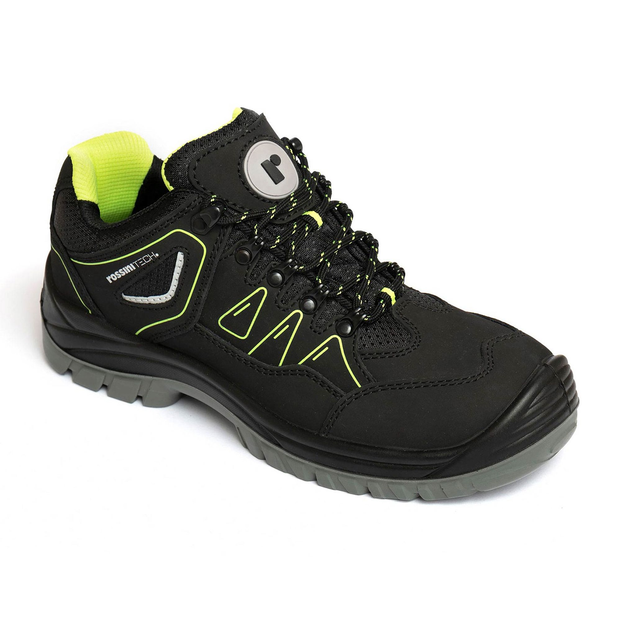 Munkacipő fekete nubuk hatású bőrből, fekete és neon zöld belső bélés, párnázott cipőnyelv, kompozit orrmerevítő, nem fémből készült talplemez. Anatómiai, légáteresztő és antisztatikus kivehető talpbetét, perforált, ütésgátló sarokkal. Kettős sűrűségű poliuretán talp. EN ISO 20345:2011 S3 SRC