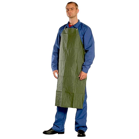 • poliészter/pamut alapra kétszer mártott PVC • 0,32 mm vastag, varrott és hegesztett • rögzítés: szalagokkal derék- és nyakrészen • 20% sósav, 30% kénsav, 30% nátriumhidroxid, 25% salétromsav és 30% ecetsav ellen min. 480 percig véd (6. osztály) • szín: zöld • méret: 110 x 75 cm • EU szabvány: EN340, EN13034:2005 + A1:2009, Type PBC